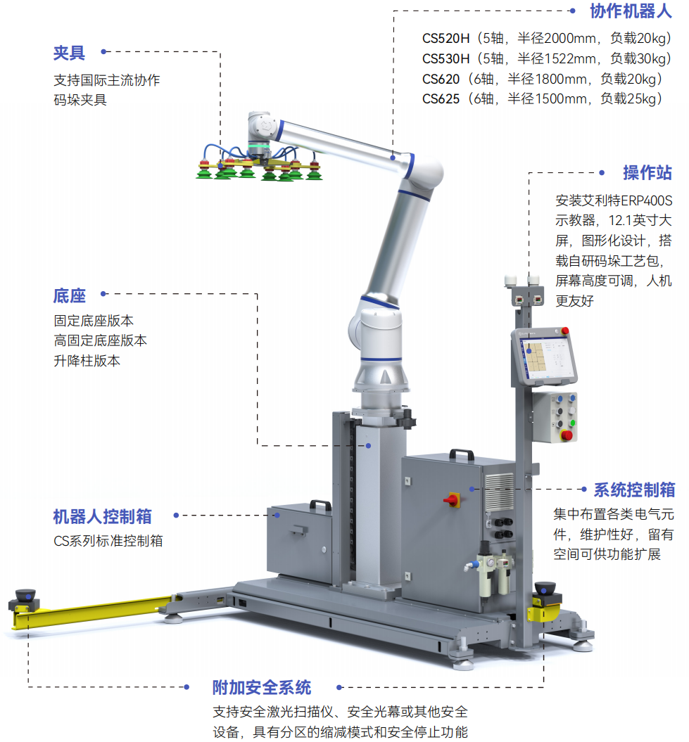 艾利特將協(xié)作機(jī)器人的靈巧作業(yè)能力與智能升降技術(shù)深度融合,推出的CP系列模塊化協(xié)作碼垛工作站,打破了傳統(tǒng)自動(dòng)化設(shè)備在空間與功能上的剛性約束,以“高柔性、高效率、快部署”三大突破,重新定義碼垛自動(dòng)化范式。