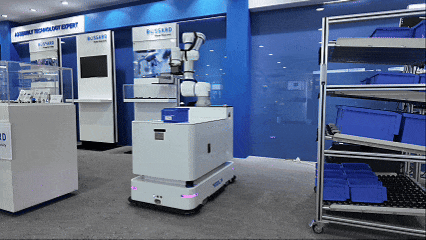 復合機器人實時接收指令,自主導航至貨架區,通過掃碼精準識別物料位置,抓取對應料盒,沿最優路徑送達工位、放置指定庫位,系統自動確認補貨完成,機器人返回等待區。