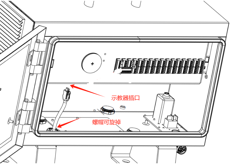 取出示教器,取下示教器線(xiàn)纜上的格蘭頭螺帽,將線(xiàn)纜穿過(guò)控制柜后蓋連接至控制柜,如線(xiàn)纜連接好后擰緊螺帽緊固線(xiàn)纜即可。
