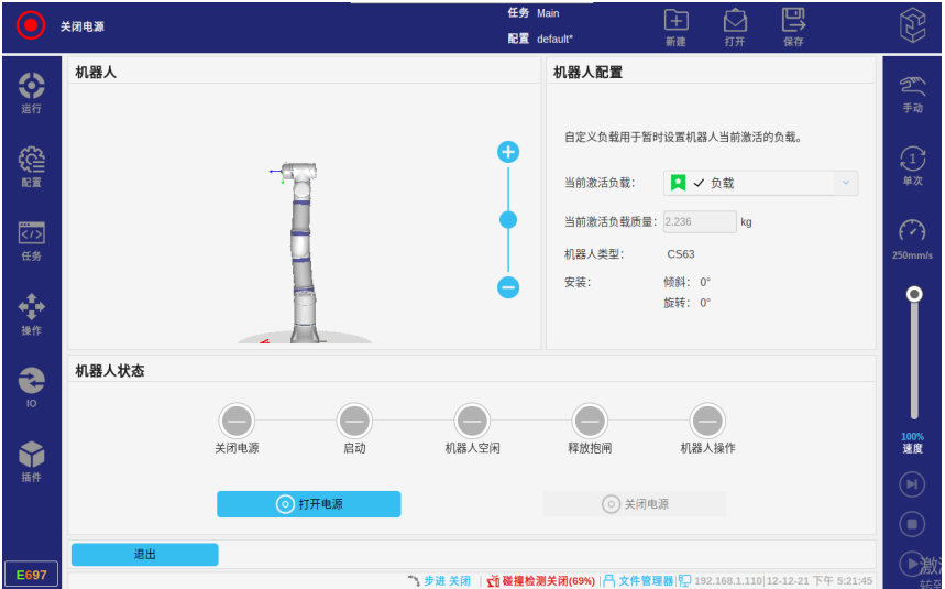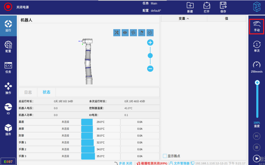 手動(dòng)高速是指手動(dòng)模式下任務(wù)運(yùn)行時(shí)的高速狀態(tài),因?yàn)檫@不是一個(gè)常態(tài)化的功能,只是對(duì)于臨時(shí)調(diào)試開(kāi)放一下速度,所以速度條的調(diào)節(jié)不可以保持(松手后速度滑條自動(dòng)恢復(fù)至默認(rèn)速度250mm),需要在手動(dòng)模式下任務(wù)運(yùn)行后,手動(dòng)調(diào)節(jié)速度滑條的位置并保持住,此時(shí)機(jī)器人會(huì)根據(jù)速度滑條的位置實(shí)時(shí)調(diào)整速度。