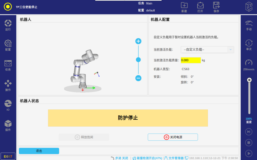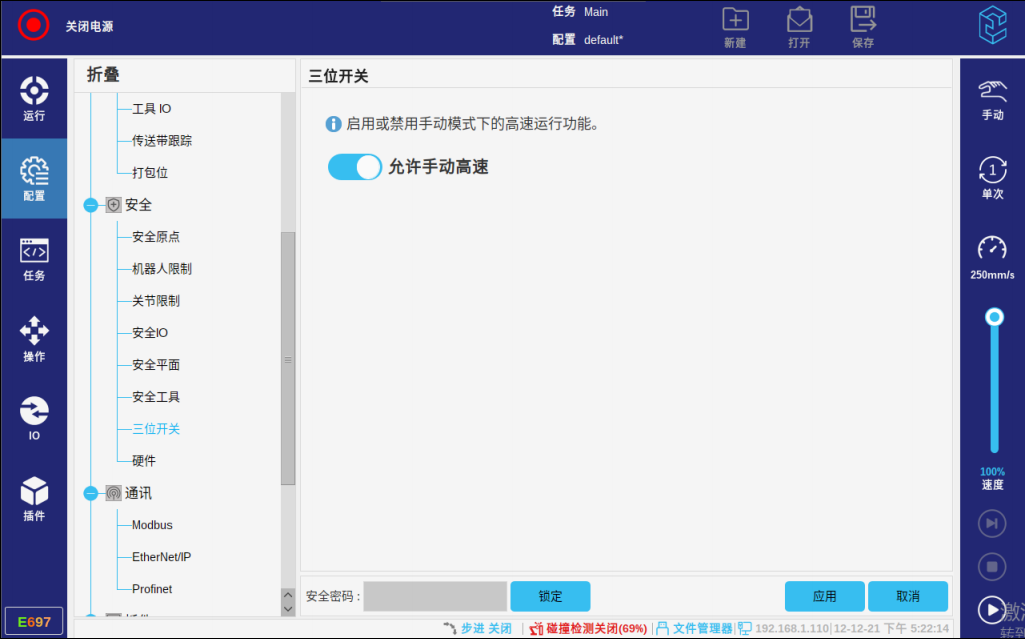 啟用手動(dòng)模式時(shí),實(shí)時(shí)調(diào)整程序運(yùn)行時(shí)的限速,需先啟用“允許手動(dòng)高速”,然后在右側(cè)控制欄中調(diào)整實(shí)時(shí)速度。點(diǎn)擊“配置 > 安全 > 三位開(kāi)關(guān)”進(jìn)入以下界面