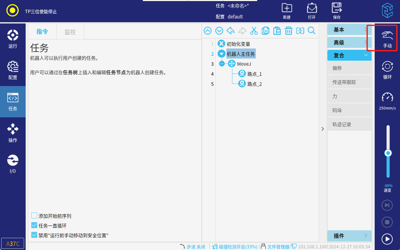● 在手動(dòng)模式下,程序編輯中只要沒(méi)有按住示教器背后的三位開(kāi)關(guān)機(jī)器人就會(huì)處于TP三位使能停止?fàn)顟B(tài),此狀態(tài)下機(jī)器人無(wú)法移動(dòng),運(yùn)動(dòng)類(lèi)的程序無(wú)法插入,故編寫(xiě)程序時(shí)可視情況按下三位使能開(kāi)關(guān)。