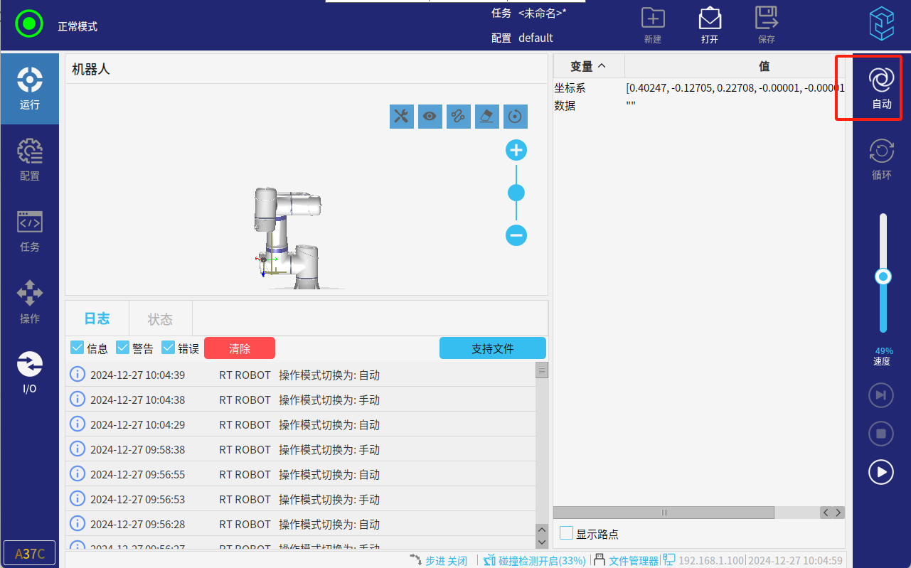 ● 程序編輯完成后可切換至自動(dòng)模式運(yùn)行程序,自動(dòng)模式下無(wú)需按下三位開(kāi)關(guān)可正常運(yùn)行程序。