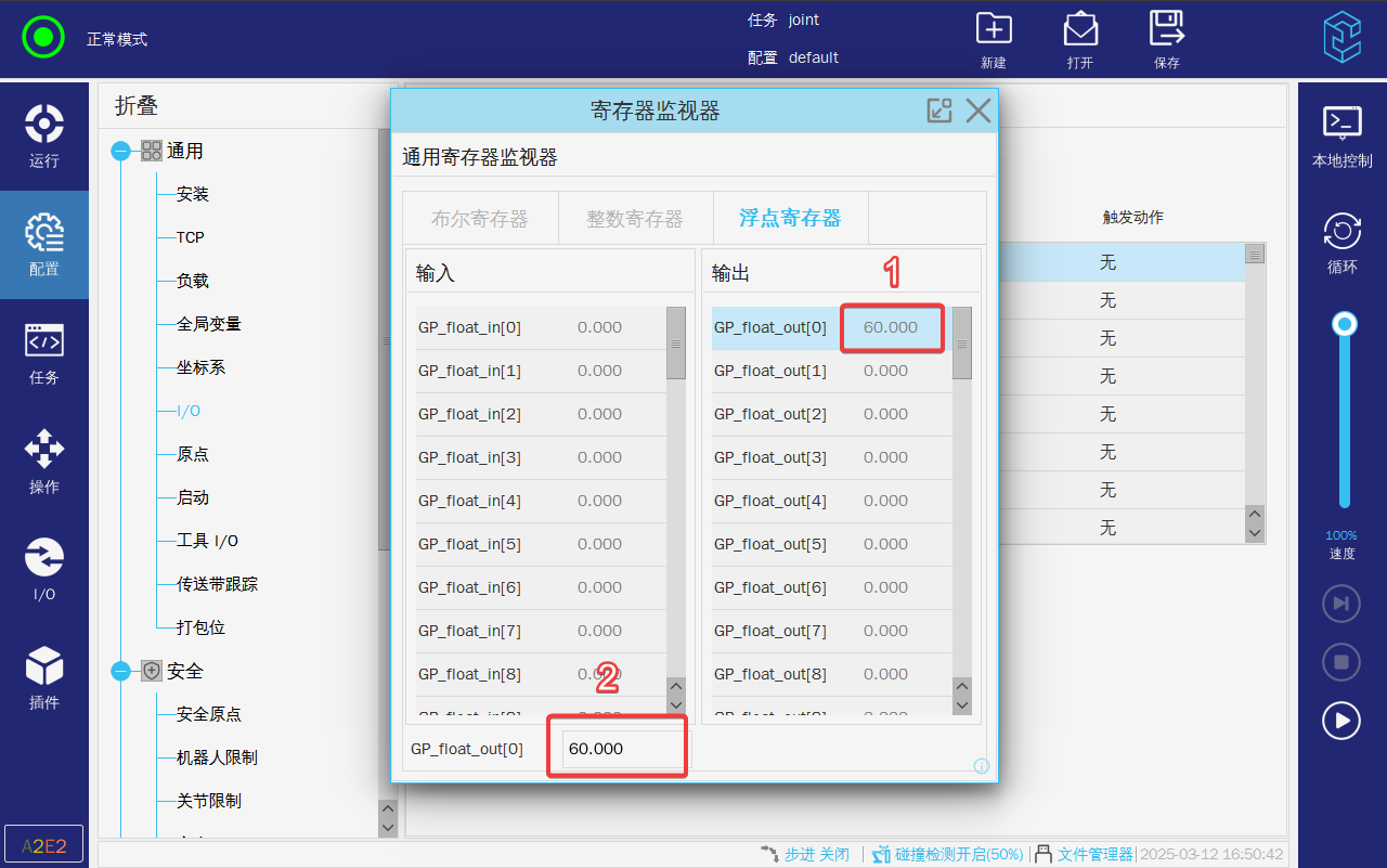 4. 浮點寄存器輸入輸出數量各47個,保留為總線通訊的輸入輸出各范圍是0-23,保留范圍外部RTSI客戶端通訊的輸入輸出范圍為23-47,(1)查看狀態,(2)輸出浮點數;