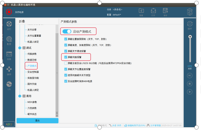 第二步:在專家模式下,選擇產(chǎn)測(cè)模式,啟用產(chǎn)測(cè)模式,勾選屏蔽伺服報(bào)警。如圖-2紅框標(biāo)記所示。