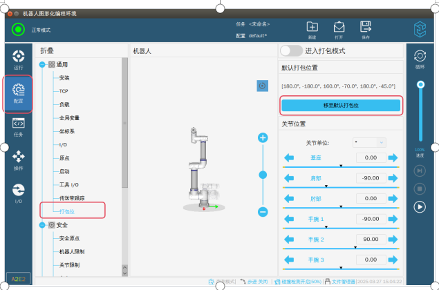 第三步:退出專家模式,這個(gè)時(shí)候因?yàn)樗欧?bào)警已經(jīng)屏蔽了,所以機(jī)器人可以正常上電了。如圖-3所示在配置界面→選擇打包位→點(diǎn)擊移至默認(rèn)打包位就可以進(jìn)入圖-4界面。