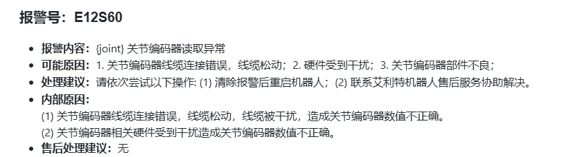 E12S60 報警所指示的是:{joint} 關節編碼器讀取異常。其具體釋義如下: