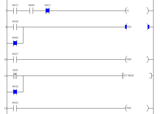第 0 行:按下啟動(dòng)按鈕(X004)為“1”M601有信號(hào),M601關(guān)聯(lián)啟動(dòng)S1。